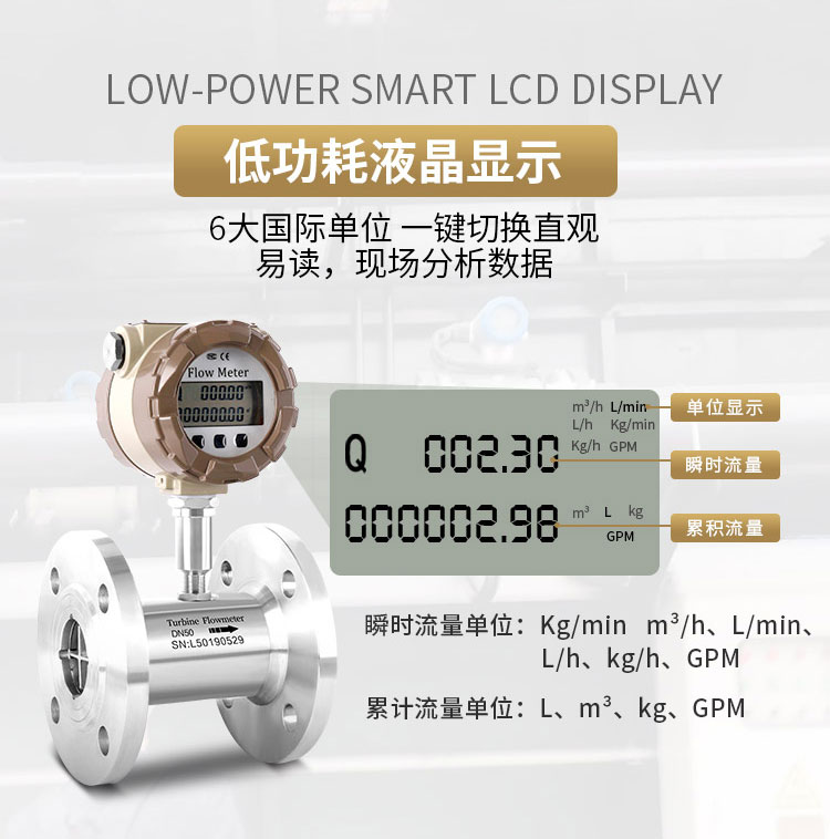 液体智能涡轮流量计采用国外先进技术生产制造的,是计量液体的流量计之一。它具有结构简单,计量精度高,使用寿命长,操作简单,容易检修等特点。仪表具备仪表系数三点修正,智能补偿仪表系数非线性,并可进行现场修正。高清晰液晶显示器同时显示瞬时流量(4位有效数字)及累积流量(8位有效数字,带清零功能。