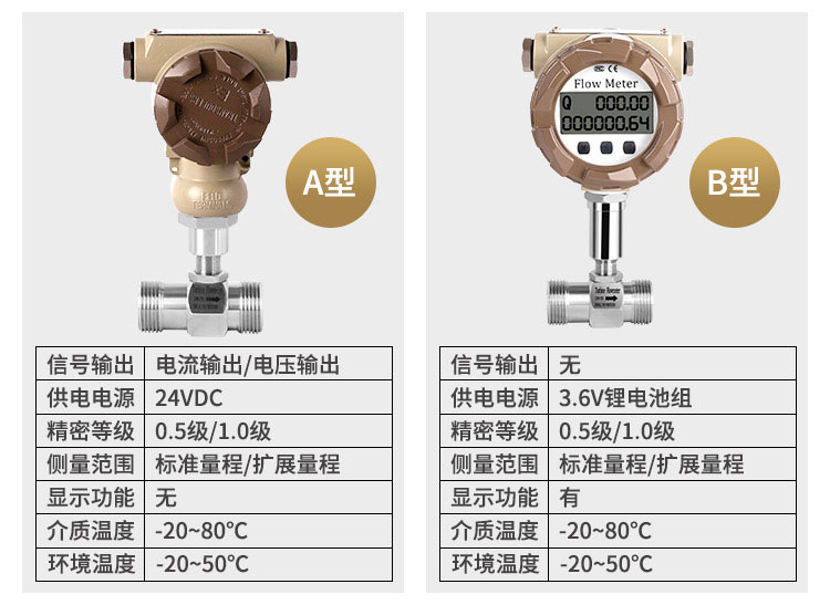 JJ-LWGY-B型:智能现场显示。说明:双排液晶表头,现场同时显示瞬时流量和累积流量,锂电池供电,电池电量可连续使用三年以上,无信号输出。标配为防爆型产品(ExdIIBT6,防爆证号:CE061580)。