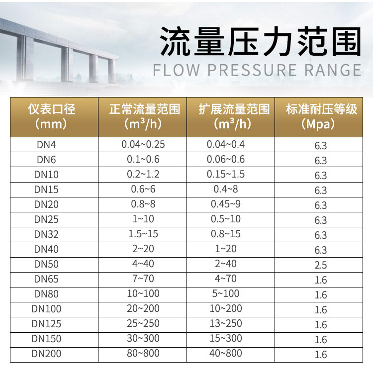 仪表口径(mm) | 正常流量范围(m3/h) | 扩展流量范围(m3/h) | 常规耐受压力(MPa) | 特制耐压等级(MPa) (法兰连接方式) |