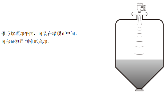测量锥型罐体,应安装在锥型罐体的平面的中间,保证可以测量锥型顶部。