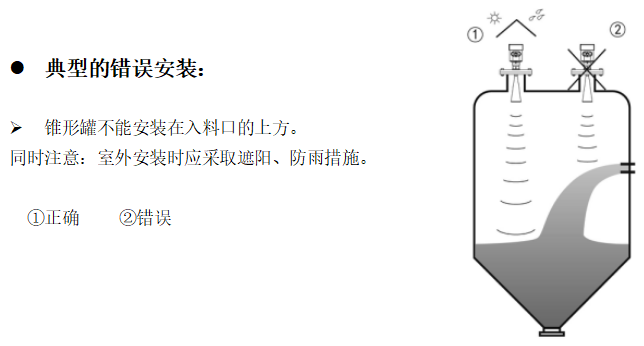 1、不要把设备安装在进料口、进料帘、漩涡等位置,被测物体在注入的时候会产生部分幅度造成虚假回波,导致数据不精确。漩涡则会引起不规则液位,影响微波信号产生散射,造成信号衰弱,导致数据不正确,特别要注意图1所示。