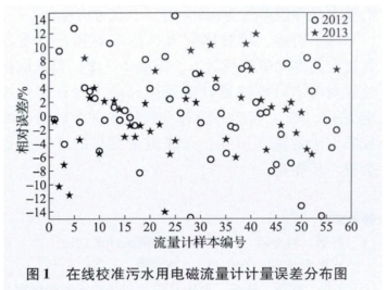 本文在线校准试验采用1.0级夹装式时差法.超声流量计作为标准表,被测流量计是管道大口径电磁流量计,校准测量时间为20~30min。在线校准方法参照JJG1033--2007《电磁流量计检定规程》和CJ/T364-2011《管道式电磁流量计在线校准要求》。2012年、2013年的部分试验结果如表2所示,其余约60台电磁流量计的试验结果以计量误差分布图给出,如图1所示。