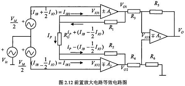 令运算放大器A1、A2、A3的输入失调电压分别为VI01、VI02、VI03,A1和A2相互失调电压为VI0,失调电流为VI0;其中VI0=VI01-VI02,这样简化得到图2.12。