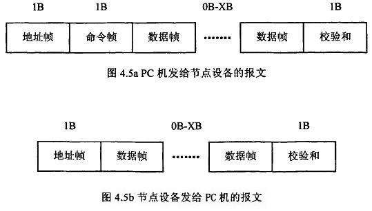 在电磁流量计等节点设备和PC机通信的过程中,由地址帧、命令帧、数据帧、校验和可组成各种功能不同的报文.由于采用主从工作方式来实现通信,电磁流量计等节点设备仅能接收并执行PC机发送来的控制命令,而不能发送命令给PC机.因此,由PC机发往流量计等节点设备的报文一般包括一个地址帧,一个命令帧,若干个数据帧和一个校验和,其报文格式如图4.5a所示:而由流量计等节点设备发往PC机的报文一般包括一个地址帧,若干个数据帧和一个校验和,其报文格式如图4.5b所示.