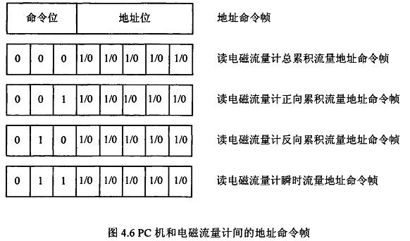 由于RS-485电气标准规定每段只能联结32个节点设备,因此可用地址帧中的5位表示这32个地址,其余3位用来表示命令,从而构成地址命令帧.对于控制命令需求不超过八个的通信系统,采用地址命令帧可压缩报文长度提高通信效率.电磁流量计和PC机通信的主要目的是将流量计采集到的数据读到PC机中.这些数据包括:总累积流量、正向累积流量、反向累积流量、瞬时流量.通信时,PC机只需向电磁流量计发送读总累积流量、读正向累积流量、读反向累积流量、读瞬时流量命令即可,因此二者间通信所用的地址帧和命令帧可合二为一,用一个地址命令帧代替.PC机和电磁流量计间的地址命令帧定义如图4.6所示.二者通信所使用的报文可简化为图4.7的格式.